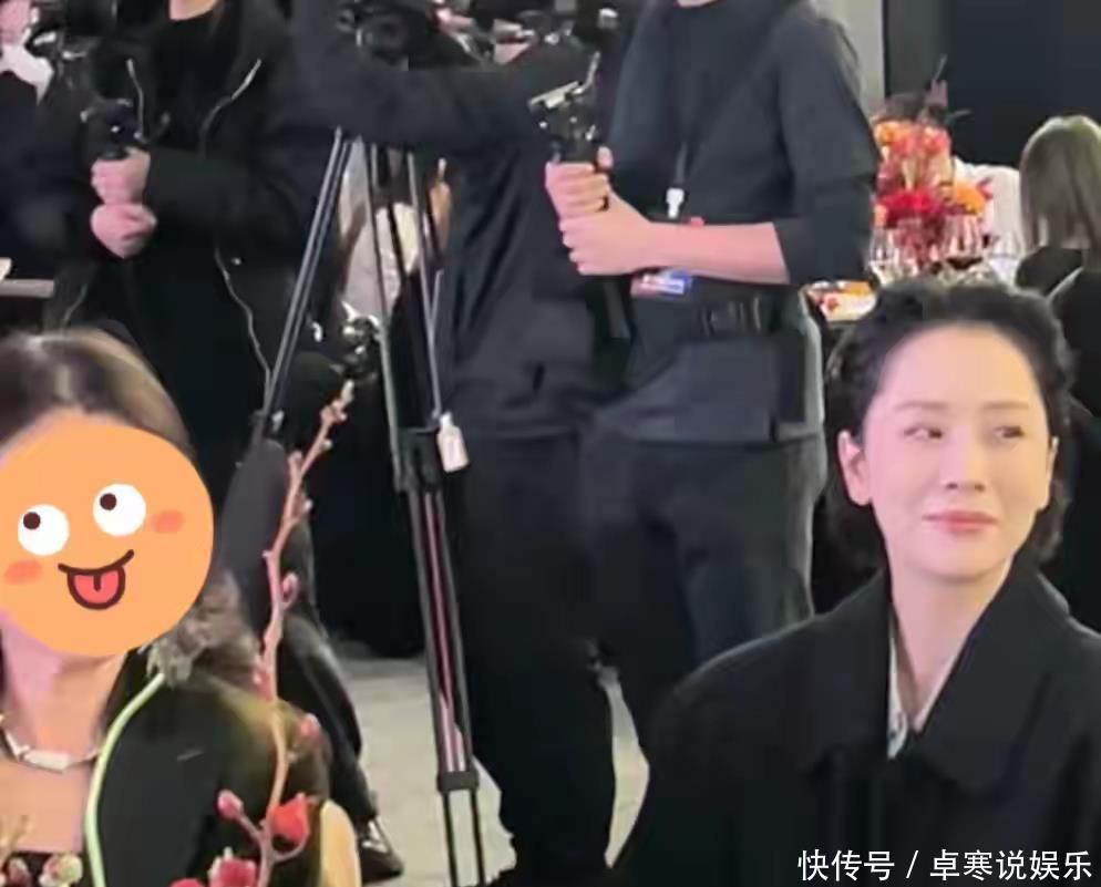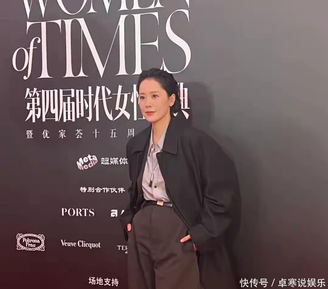 就在几步之遥,海清以另一种姿态承接了同样的目光。一身利落黑色大衣,头发全部梳起,露出光洁的额头。她没有刻意对抗什么,脸上干干净净,是时光流过却未过分雕琢的模样。年轻时不曾被惊为天人的那份清丽,如今在从容的气韵里舒展开来,反而成了一种更有力量的风景。她的美,不在于紧绷,而在于接受——接受皱纹可能来访,接受皮肤不再紧绷,却让眼神愈发清澈有光。